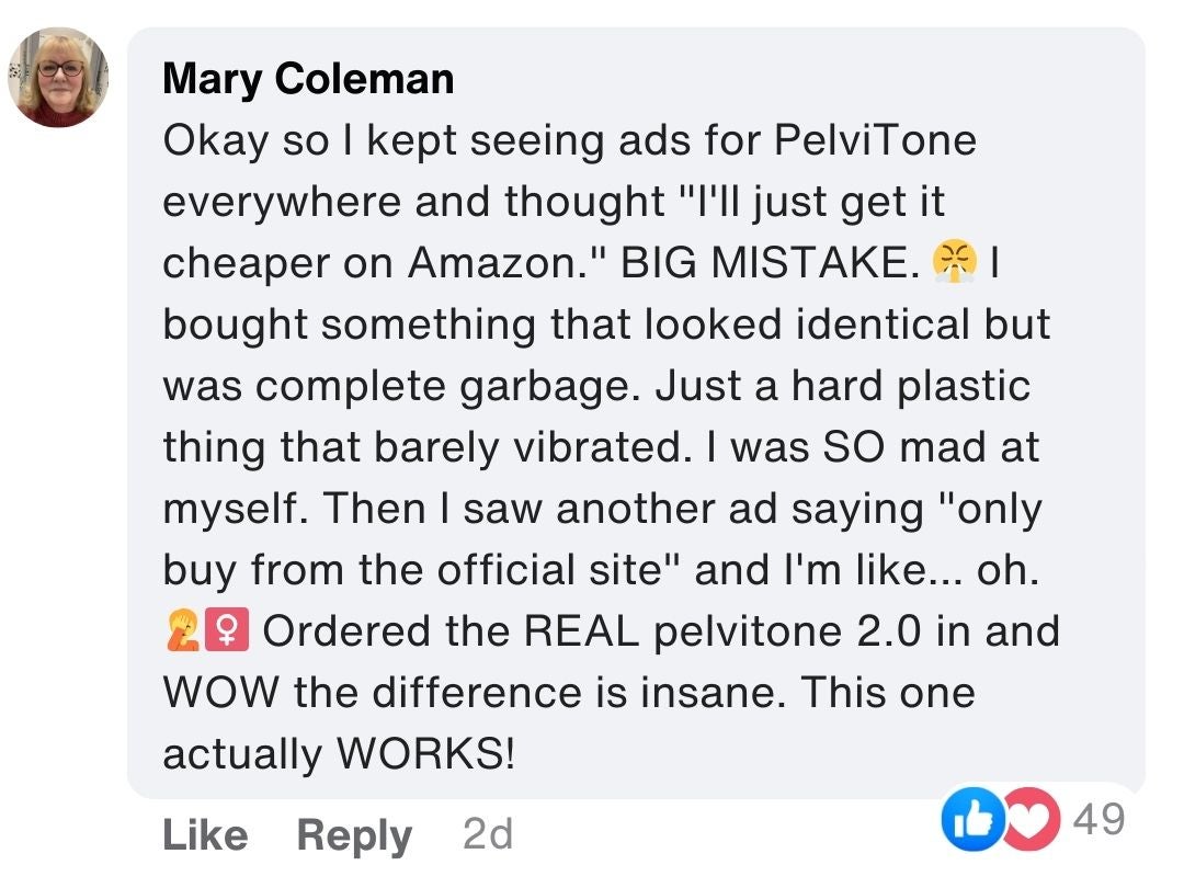 I almost gave up on this whole idea. I bought what I THOUGHT was PelviTone from Amazon last year for and it did absolutely nothing. Didn't feel anything, no results, total waste of money. I was ready to accept that I'd just leak forever. 😞 Then I saw someone in this group say the real one is ONLY sold on their website and those Amazon ones are all fakes. I felt so stupid but also relieved? Ordered the actual PelviTone 2.0 and started using it in January. You guys... I can sneeze now without crossing my legs. I can LAUGH without panicking. It's only been 6 weeks and I'm already seeing changes I never got with the fake one. Don't be like me—skip Amazon and go straight to the source!!