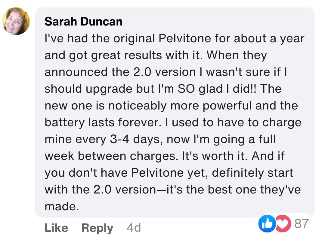 My sister bought the original PelviTone last year and wouldn't stop talking about it. Like WOULD NOT STOP. 😅 When the 2.0 came out she upgraded and told me I needed to get one too because "it's even better now." I finally caved and ordered one. She was right. (Don't tell her I said that lol.) I'm 5 weeks in and the difference in my bladder control is crazy. I was wearing those Poise pads literally every single day. Now I only wear them if I'm going somewhere I'll be walking a lot, just to be safe. But most days? Don't even need them. My only regret is not listening to my sister sooner. If someone in your life keeps telling you to try this, LISTEN TO THEM.