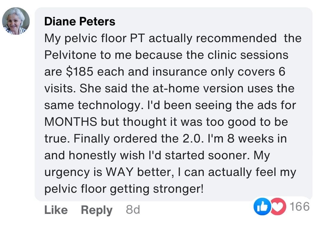 Let me do the math for you: Pelvic floor PT near me is $175 per session. Insurance covers MAYBE 6 sessions. That's $1,050 out of pocket for 6 visits. The PelviTone 2.0 costs less than 3 PT sessions and I can use it EVERY DAY for the rest of my life. I'd been seeing the ads and kept thinking "I should just do PT" but the cost was stopping me. Finally decided to try PelviTone first since it has a 90-day guarantee. Best. Decision. Ever. I've been using it for 7 weeks and getting results that my friend who IS doing PT says are similar to what she's getting—except I'm doing it from my couch in 5 minutes while she's driving across town twice a week and paying a fortune. If cost is holding you back from getting help, this is your answer. And yeah, get the 2.0 version, it's the newest one with all the improvements.